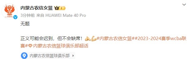 随后,内蒙古女篮官博发文写道:“正义可能会迟到,但不会缺席!”
