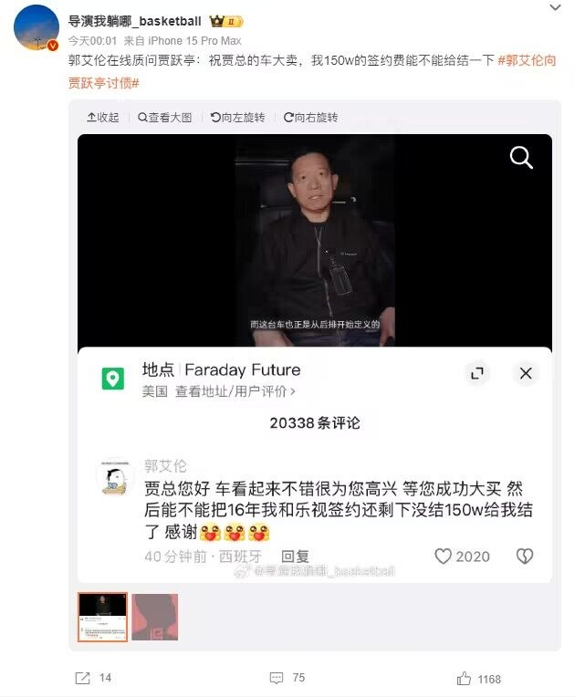 他写道:“贾总您好,车看起来不错,很为您高兴!等您成功大卖,然后能不能把16年我和乐视签约还剩下没结150W给我结了,感谢!”