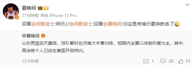 而山东广播电视台体育频道体育新闻主编夏晓司也在回复网友时表示,山东男篮将更换主教练。