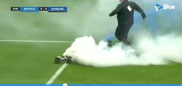 如果按照常态,2月17日晚8点(北京时间)罗斯托克对阵汉堡的德乙联赛应该很难吸引到什么额外的关注。因为几乎同一时段有萨拉赫在非洲杯之后的复出之战,也能看到马竞痛打拉斯帕尔马斯。但是意外发生了,第9分钟,两辆改装过的遥控车冲进了球场,不仅能在草地上飞驰,还能喷出烟雾,令工作人员手足无措,比赛也因此暂停了好一会。