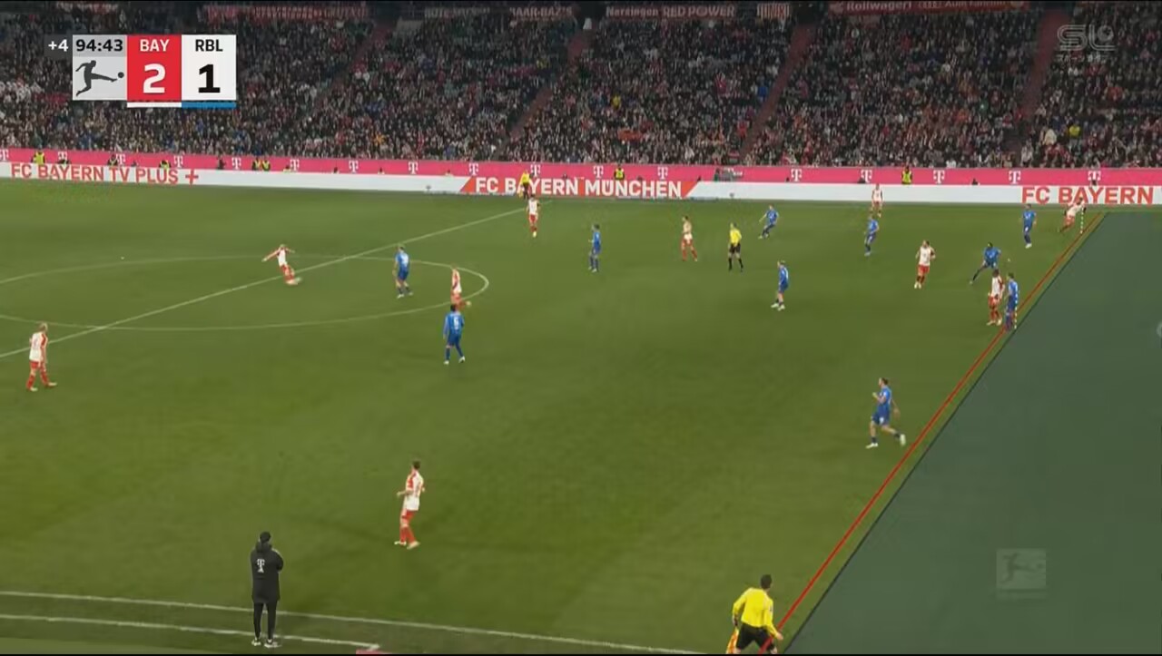 比赛第91分钟,舒波莫廷禁区内挑传,凯恩左脚凌空斩破门,拜仁2-1莱比锡!