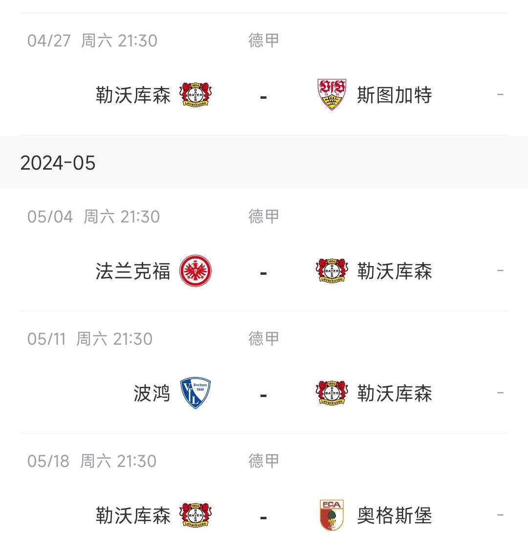 勒沃库森最后8轮赛程↓