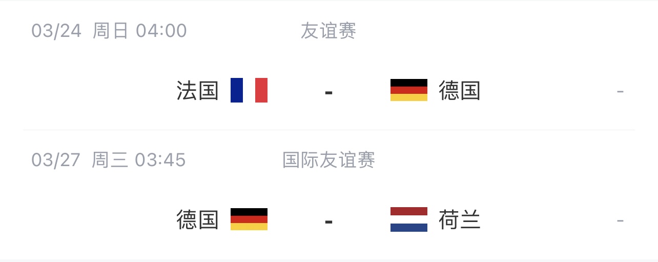 3月的国际比赛日,德国队将参加2场友谊赛,北京时间3月24日4点客场对阵法国,3月27日3点45主场对阵荷兰。FIFA排名上,德国第16,法国第2,荷兰第6。