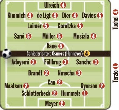 前卫:萨内(5分)、穆勒(5分)、穆西亚拉(4分)