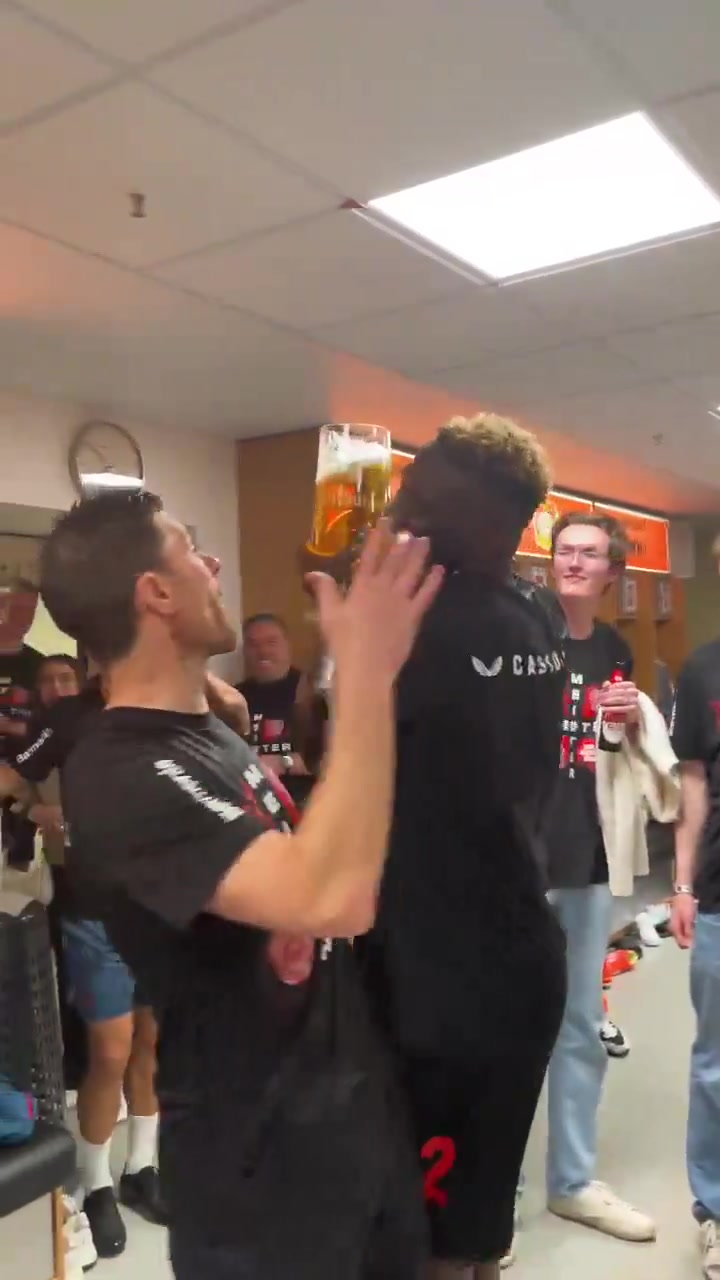 ????啤酒浴不停,博尼法斯拿着一大杯啤酒为阿隆索“淋浴”
