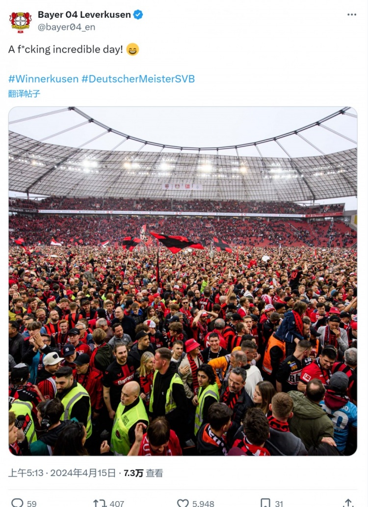 勒沃库森官方账号在社交媒体上晒出球迷们冲入场内庆祝夺冠的照片,并写道:“真XX是不可思议的一天!”