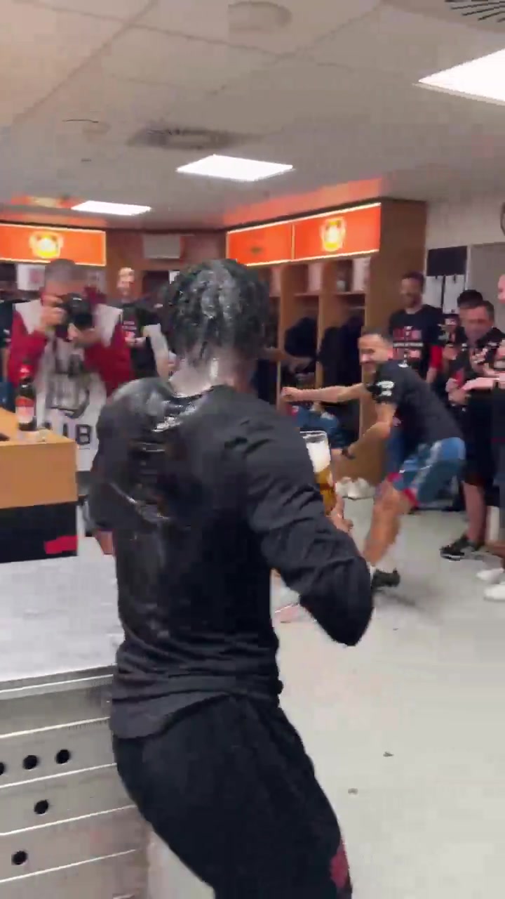 04月15日消息 勒沃库森5-0战胜提前五轮夺冠,赛后更衣室内,弗林蓬拿着一大杯啤酒疯狂追逐塔普索巴,淋了后者一身。