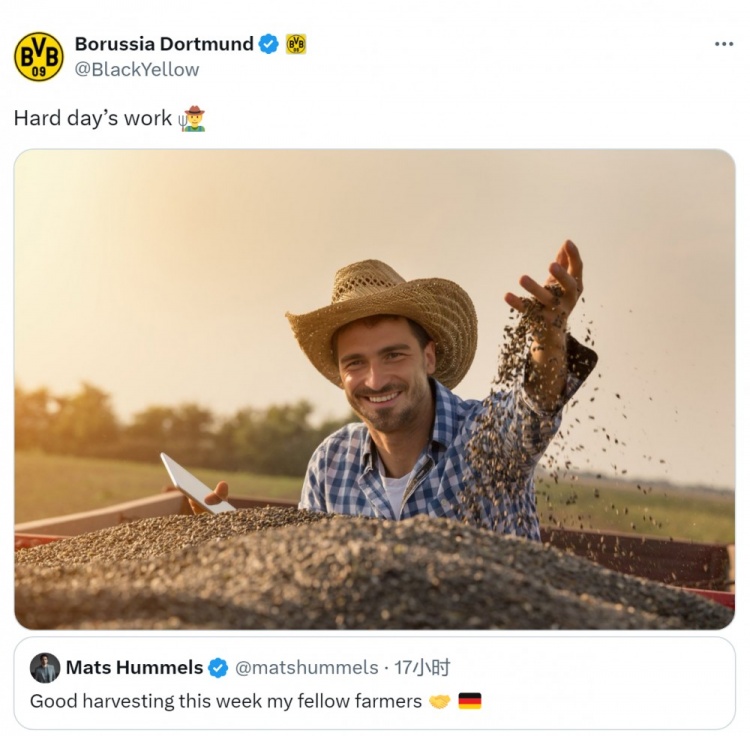 德甲联赛常被嘲讽为“农民联赛”,多特后卫胡梅尔斯在社交媒体上打趣道:“我的农民朋友们,本周收成不错。”