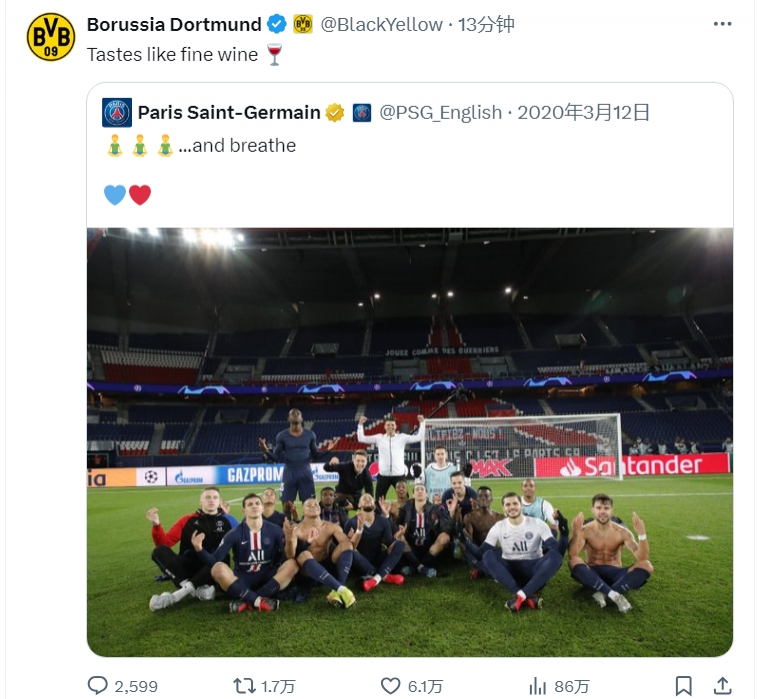 多特官推紧接着又发了一条庆祝推文,与巴黎的当时推文几乎一摸一样,意义不言自明。