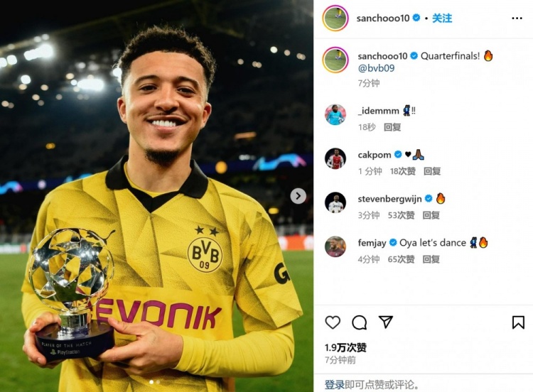 闪击破门!官方:桑乔当选多特2-0埃因霍温全场最佳球员