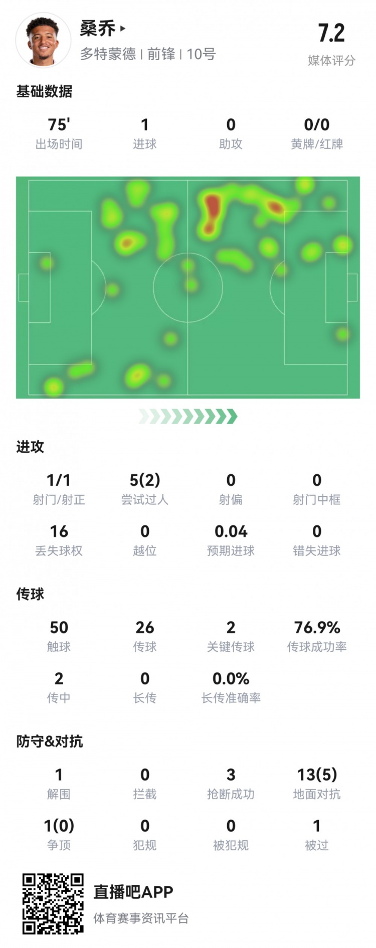 连场破门!桑乔本场数据:1射1正1粒进球,2次关键传球,评分7.2