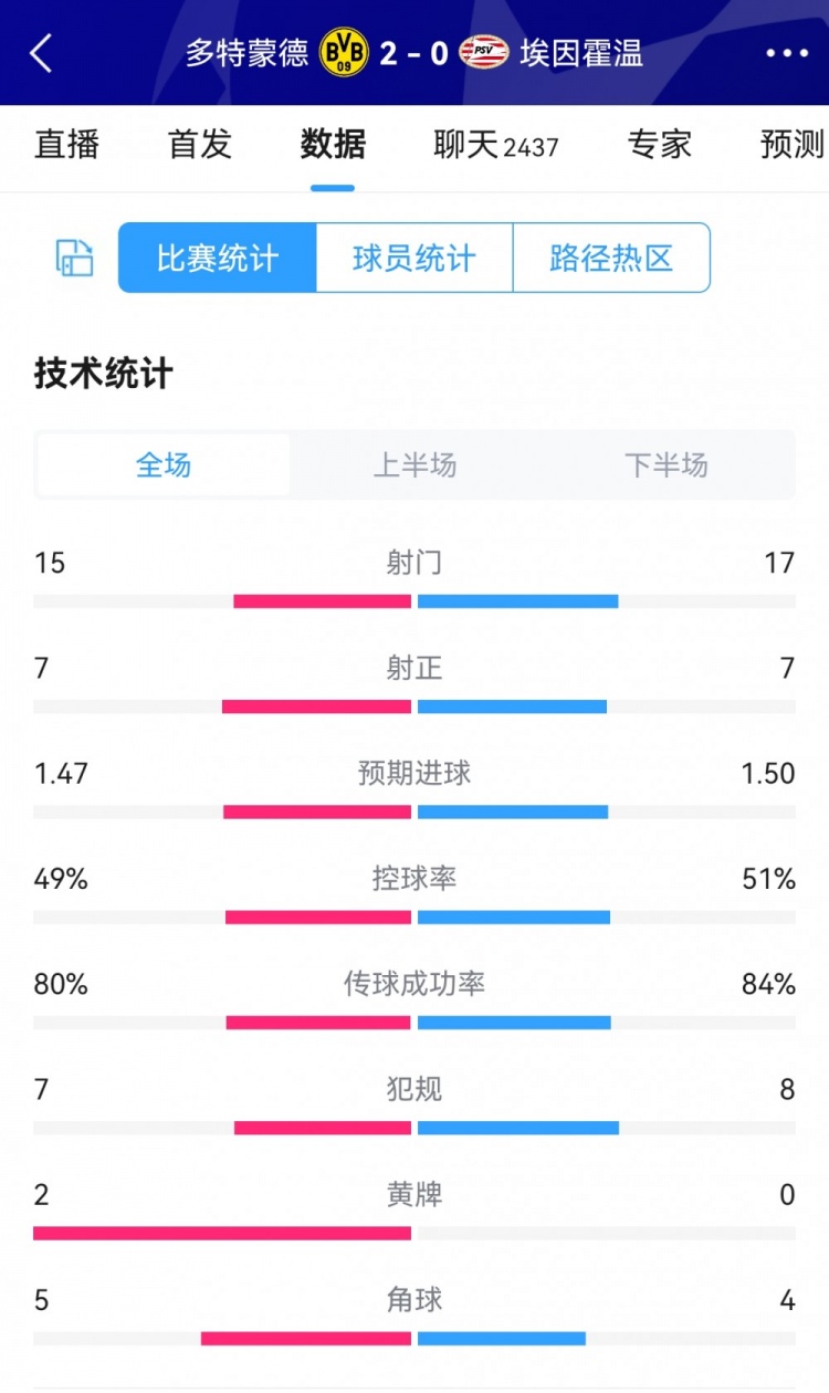 多特2-0埃因霍温全场数据对比:射门15-17,射正7-7,角球5-4