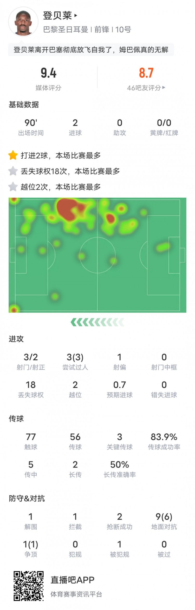 登贝莱本场比赛数据:2进球3关键传球3过人成功,评分9.4