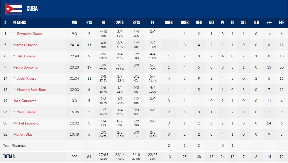 这是古巴男篮历史上首次战胜美国男篮,此役他们阵中有3人得分上双,伯姆比诺拿下19分5篮板;美国队名单有11人效力于发展联盟(1人在以色列联赛打球),雷匡-格雷本场得到17分+5犯离场,乔丹-贝尔拿到4分5篮板,斯坦利-约翰逊9投2中+5犯离场,埃尔弗里德-佩顿拿到5分.