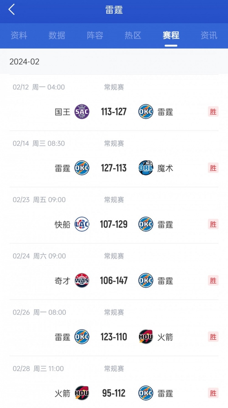 NBA常规赛,雷霆112-95战胜火箭,喜提6连胜。