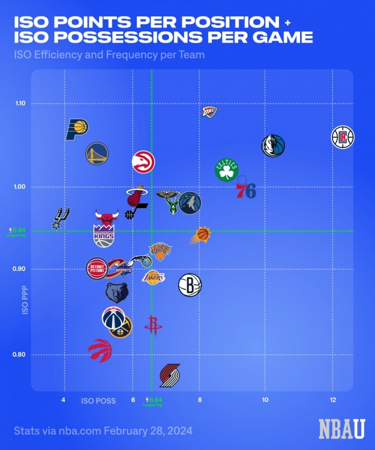 联盟各队平均:场均6.64次单打、平均每次得0.94分