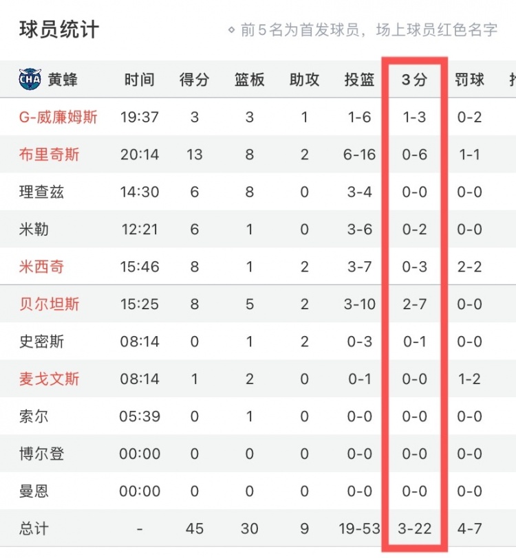 上半场,黄蜂全队外线手感冰凉,三分球合计22中3,其中前17投全部打铁,布里奇斯一人6中0。