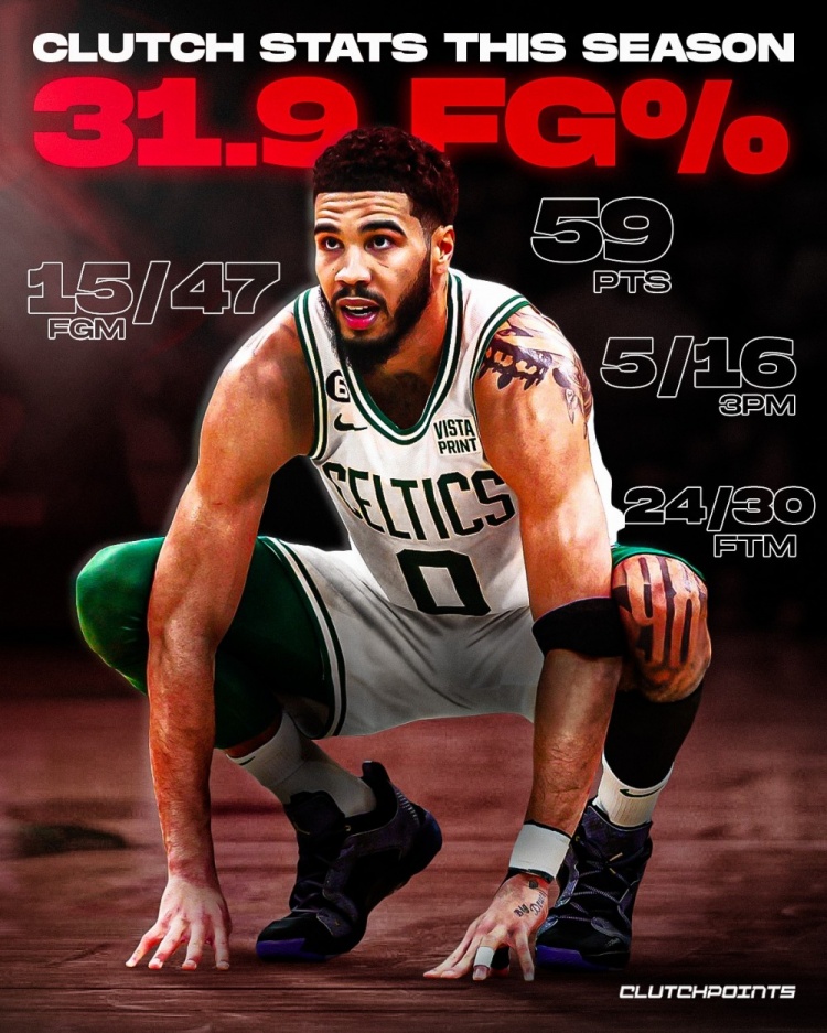 塔图姆本赛季关键时刻合计47投15中,命中率31.9%,三分16投5中,罚球30中24,共得到59分。