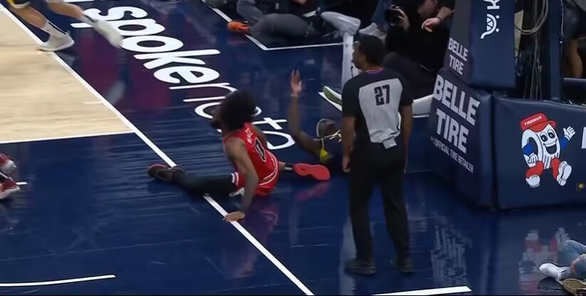 在昨天公牛客场加时战胜步行者的比赛中,科比-怀特在第四节最后时刻上篮被帽,随后被西亚卡姆压到大腿,受伤离场。