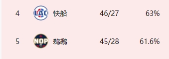 快船战绩46胜27负,排名仍在西部第4,与鹈鹕胜场差再次来到1个。