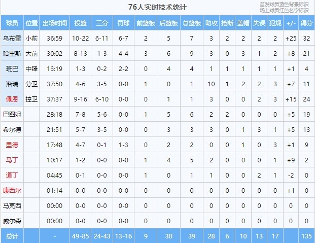 本场比赛,76人内外双核恩比德和马克西均缺阵,但球队全民皆兵,9人有得分进账,6人得分上双,其中乌布雷32分,佩恩24分,哈里斯21分,巴图姆19分,希尔德13分,洛瑞11分。