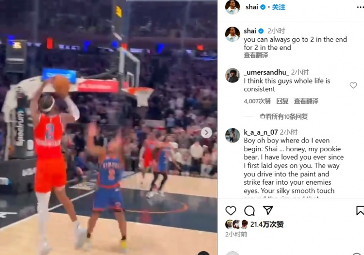 4月2日消息 今天,雷霆球星亚历山大晒出了昨天准绝杀尼克斯的视频,并写道:“在最后关头,你永远可以相信2号能够得2分。”