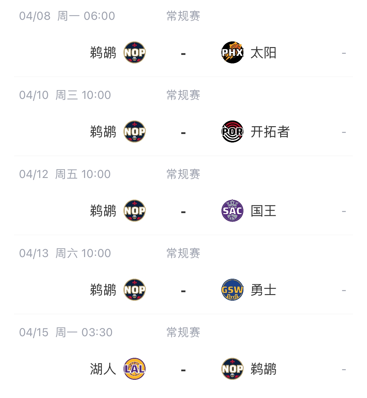 鹈鹕最后5场比赛将对阵太阳、开拓者、国王、勇士和湖人。