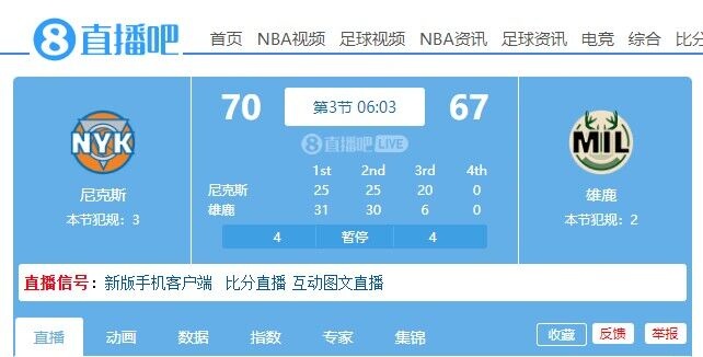 4月8日消息 NBA常规赛,尼克斯和雄鹿下半场比赛正在进行。