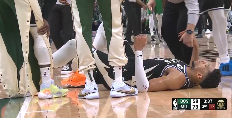 字母哥捂着小腿,他在月初深受左跟腱酸痛困扰;