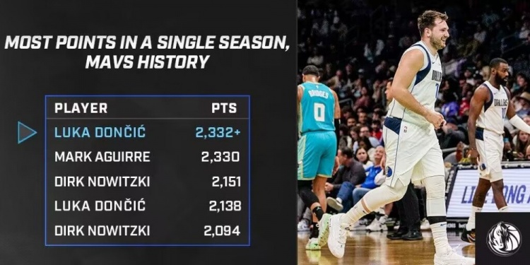 据统计,东契奇本赛季总得分已经达到2332分,打破了马克-阿奎尔在1983-84赛季创造的队史单赛季得分纪录2330分。