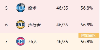 今日比赛后,魔术、步行者、76人三队目前战绩相同,均为46胜35负,魔术凭借目前是东南赛区冠军,在三队中排名第一,位列东部第五;步行者面对76人有交手优势,因此步行者排名东部第六,76人则是排在东部第七。