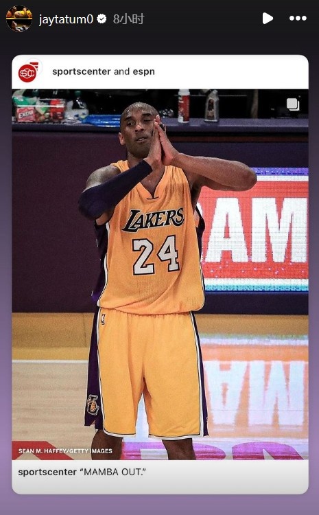 科比门徒、凯尔特人当家球星杰森-塔图姆转发了科比的谢幕照,图片配文:“曼巴,OUT。”