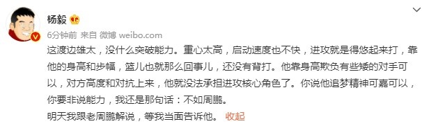 杨毅依然坚持这观点:打亚洲比赛周鹏比渡边好使 专进关键球