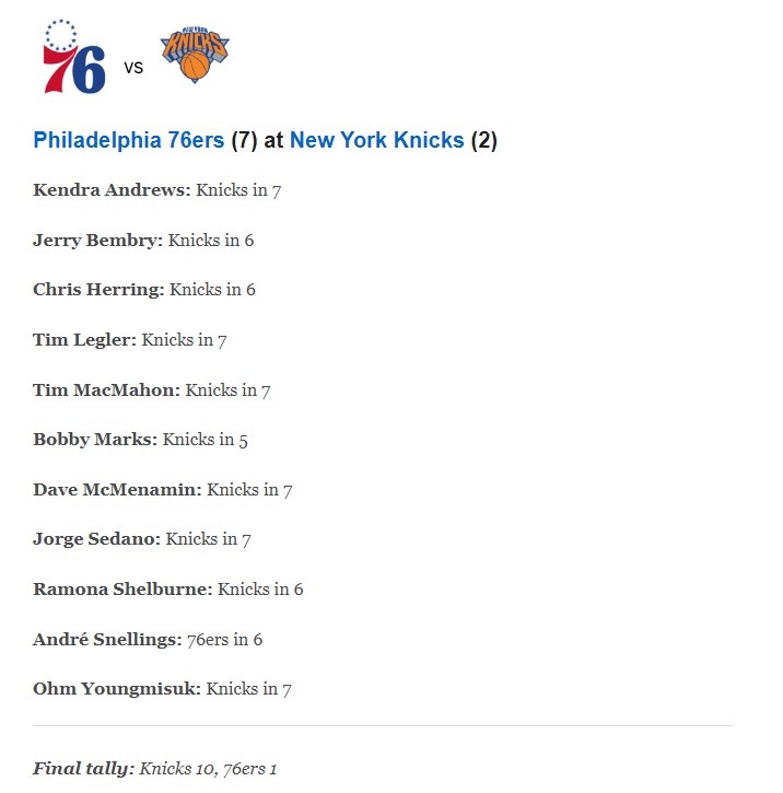 4月20日消息 今天,ESPN组织专家团对尼克斯和76人的系列赛结果进行了预测,参加预测的11名专家中,有10人预测尼克斯将淘汰76人。
