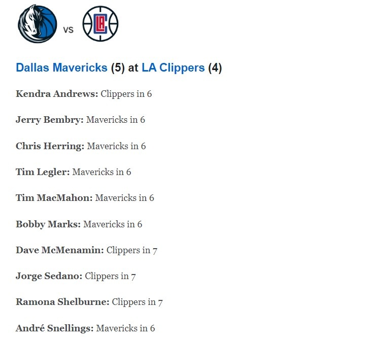 4月20日消息 今天,ESPN组织专家团对独行侠和快船的系列赛结果进行了预测,参加预测的10名专家中,有6人预测独行侠将淘汰快船。