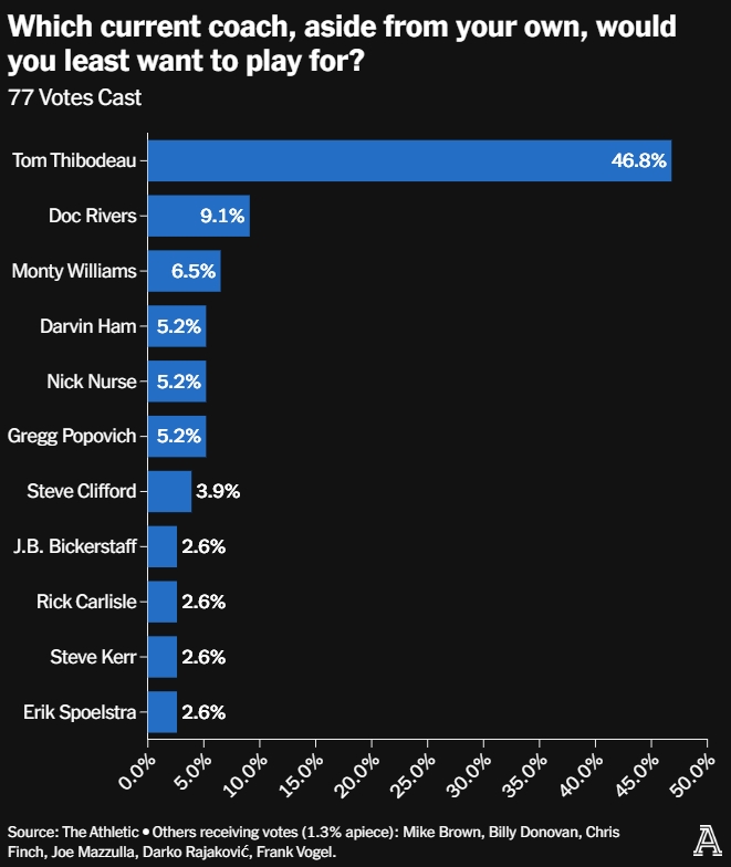 在关于最不想效力的主帅(除了自己的主帅)投票中,有77人进行了参与。最终锡伯杜以46.8%的得票率高居榜首。