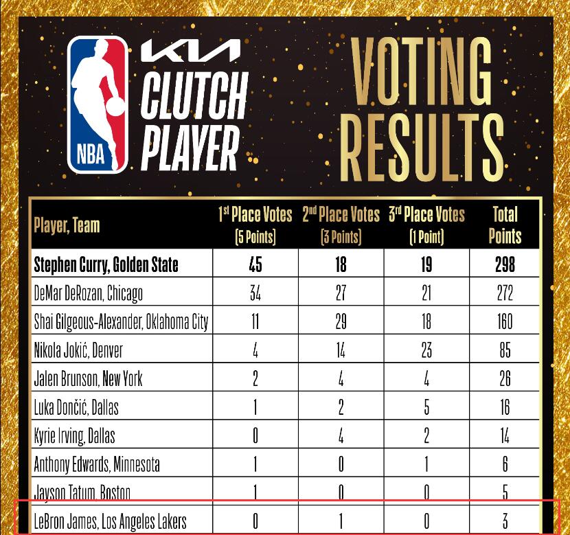 ????詹姆斯获得一张最佳关键球员奖第二选票