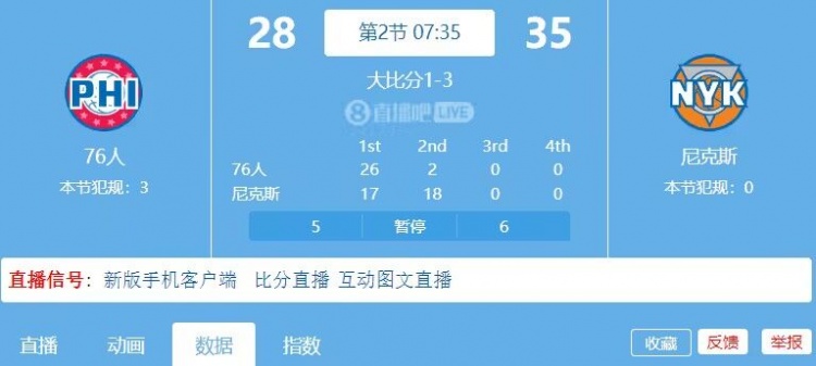 目前比赛进行到第二节,首节只拿到17分并且落后76人9分的尼克斯发起反扑,四分多钟的时间轰出18-2的攻势直接实现反超。