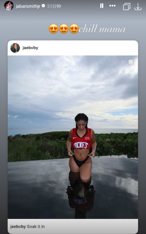 05月03日消息 火箭前锋小贾巴里-史密斯的女友Jasmine今日更新个人Instagram,晒出多张自己身穿史密斯球衣拍摄的照片,并配文:“浸在水中。”史密斯本人随后也进行了转发。