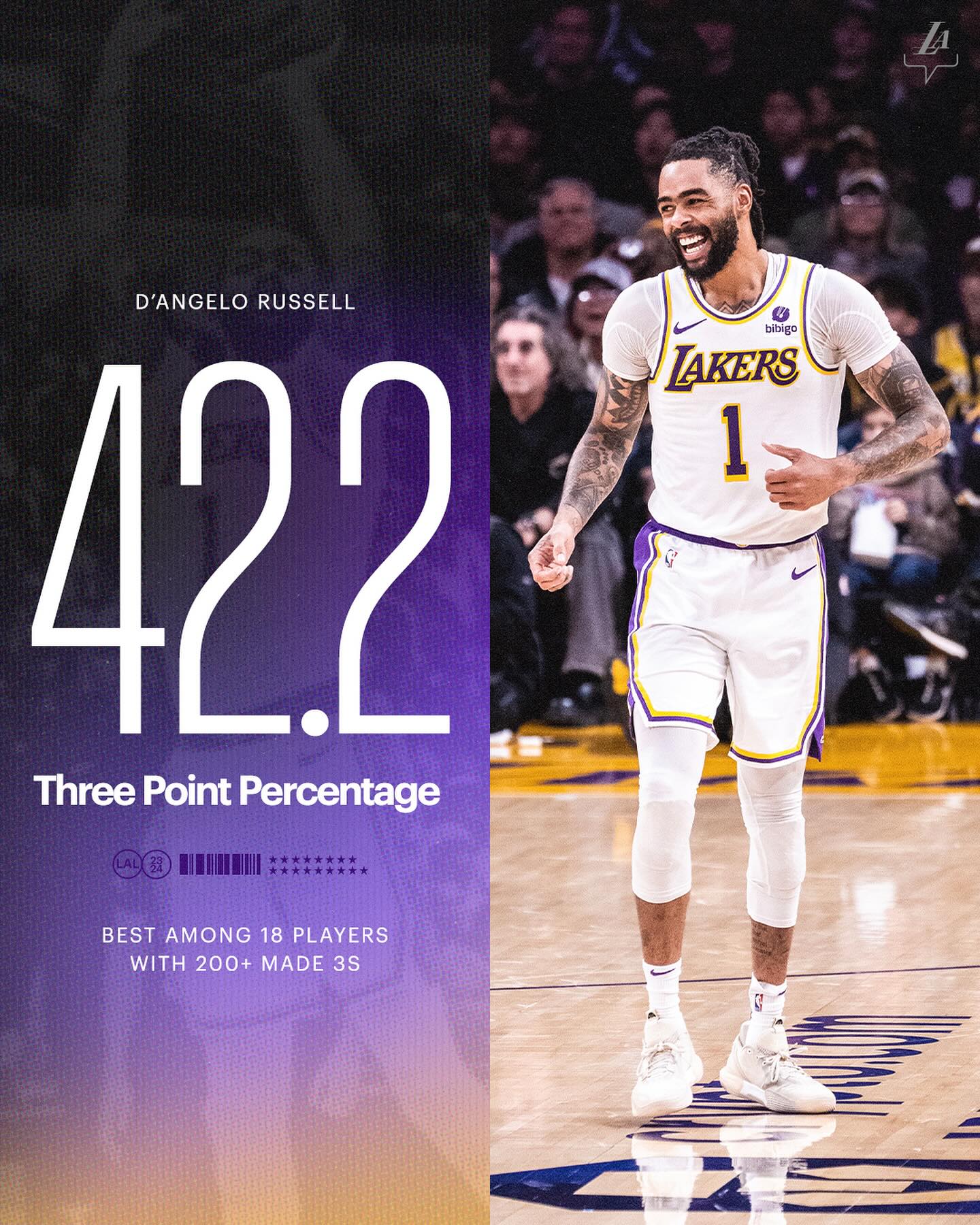 进化了!拉塞尔本赛季三分命中率42.2% 命中超200次球员中排第一