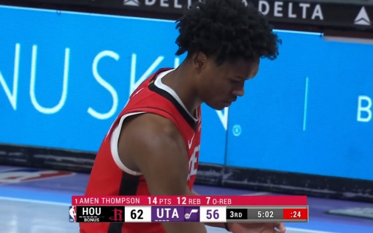 活力十足!阿门-汤普森两节半拿到14分12板 其中7前场板
