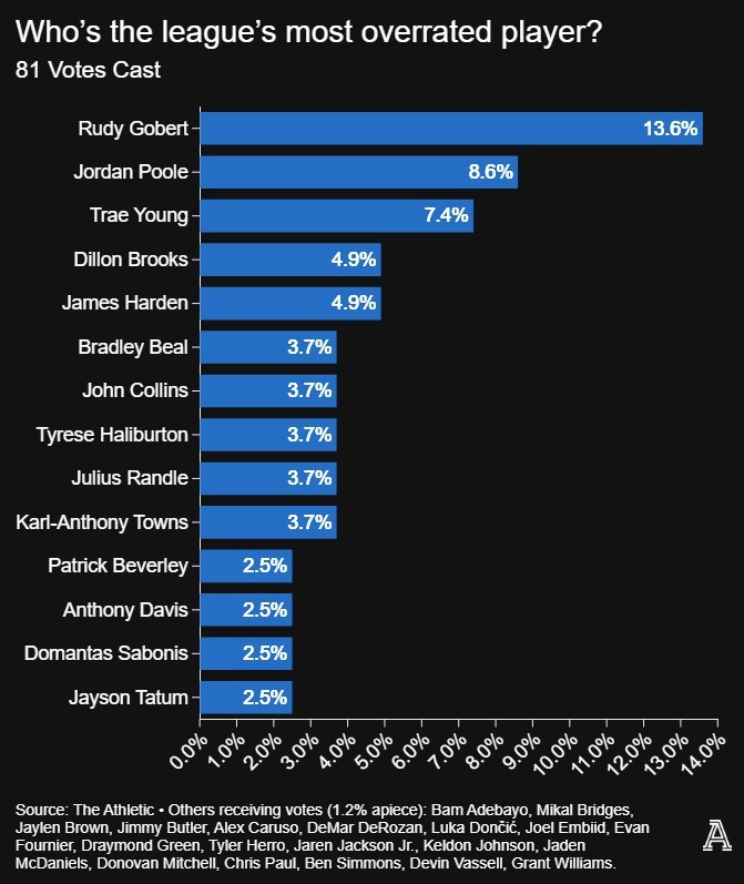 球员匿名票选最被高估球员:戈贝尔榜首 普尔第二 特雷-杨第三