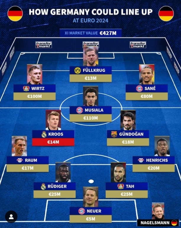 2月23日消息 克罗斯官宣回到德国国家队,德国转会市场网预测德国队欧洲杯首发,克罗斯、京多安和穆西亚拉搭档中场。