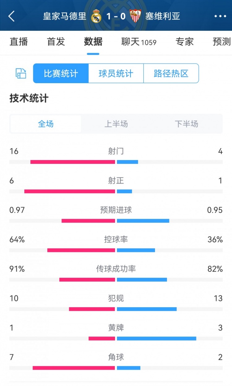 2月26日消息 本轮西甲皇马1-0塞维利亚,双方全场数据对比如下↓(皇马在前)