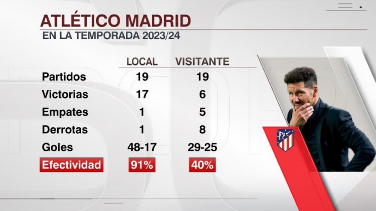 ESPN统计了马竞本赛季主场和客场的战绩,并作出对比,床单军团主客场战绩差距明显。