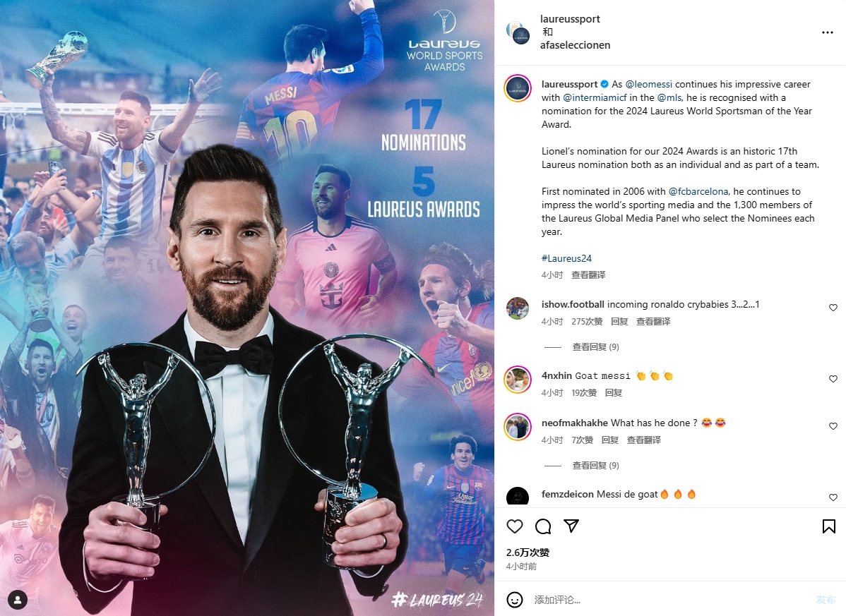 劳伦斯官方写道:随着梅西在MLS联赛与迈阿密国际一起继续其令人印象深刻的职业生涯,他获得了2024年劳伦斯世界年度运动员奖的提名。