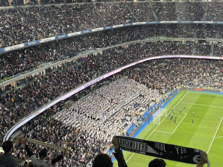 3月11日消息 西甲第28轮,皇马主场对阵塞尔塔的比赛正在进行。现场的皇马球迷拉出横幅,声援遭到禁赛的贝林厄姆。横幅中写道:Hey Jude!马德里主义者们(皇马球迷的昵称)和你同在!