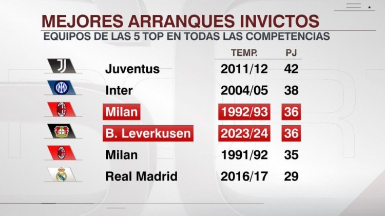 据ESPN统计,勒沃库森本赛季开局各赛事36场不败,开局不败场次追平1992-1993赛季的米兰,距离尤文保持的五大联赛纪录差6场。