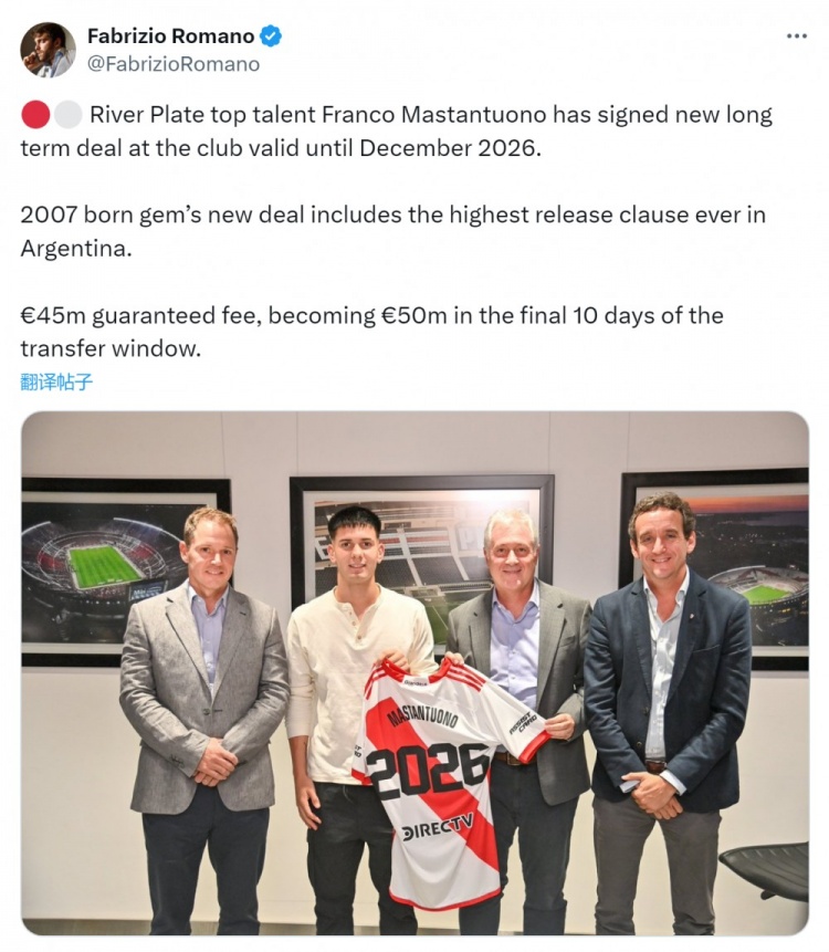 罗马诺指出,河床已经与马斯坦托诺续约至2026年12月,这位16岁攻击型中场新合同中解约条款的基本金额为4500万欧元,转会窗口最后10天升至5000万欧元,这创造了阿根廷国内联赛球员解约金的历史最高纪录。