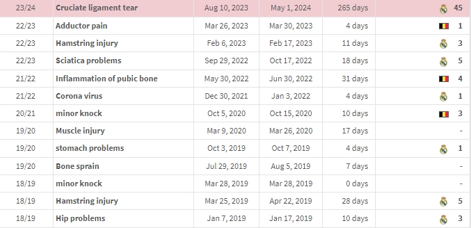 2023-24赛季:十字韧带撕裂,已休养265日,缺阵45场皇马比赛